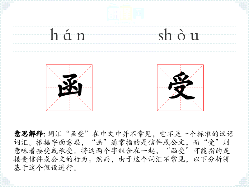 词汇“函受”在中文中并不常见,它不是一个标准的汉语词汇。根据字面意思,“函”通常指的是信件或公文,而“受”则意味着接受或承受。将这两个字组合在一起,“函受”可能指的是接受信件或公文的行为。然而,由于这个词汇不常见,以下分析将基于这个假设进行。