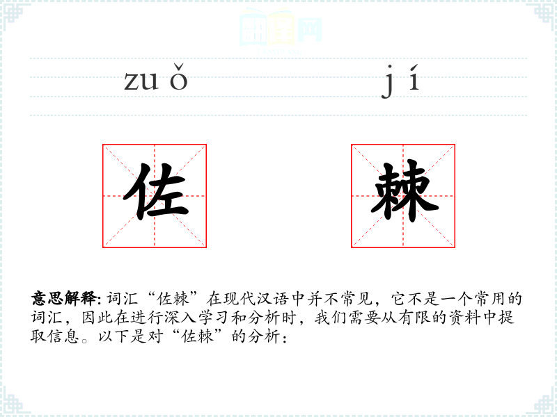 “佐”字在古代汉语中意为辅助、帮助,而“棘”字则指荆棘,通常与困难或障碍相关。这个词汇可能是由这两个字组合而成,用来描述在提供帮助时遇到的困难。