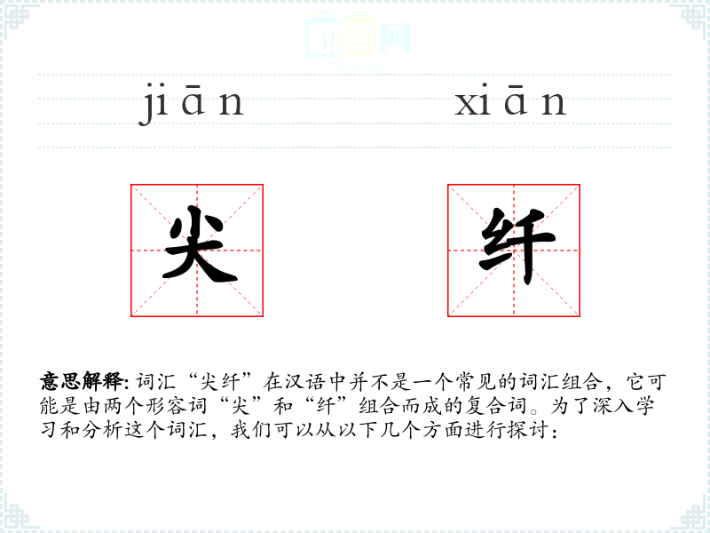 - 在描述一个人的外貌或气质时,可能会用到“尖纤”来形容其细腻和精致的特点。