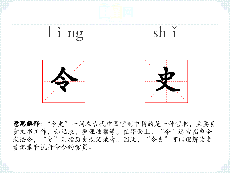 “令史”一词在古代**官制中指的是一种官职,主要负责文书工作,如记录、整理档案等。在字面上,“令”通常指命令或法令,“史”则指历史或记录者。因此,“令史”可以理解为负责记录和执行命令的官员。