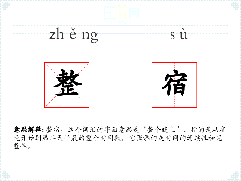 整宿:这个词汇的字面意思是“整个晚上”,指的是从夜晚开始到第二天早晨的整个时间段。它强调的是时间的连续性和完整性。