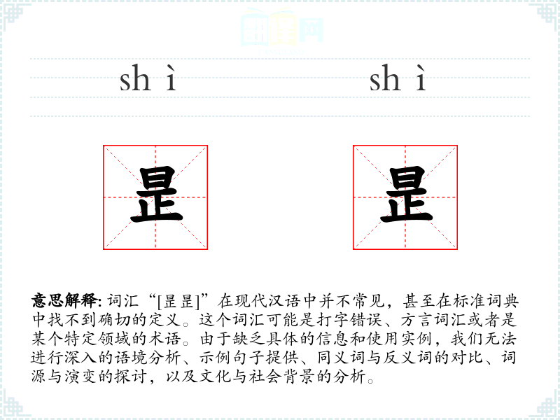 词汇“[昰昰]”在现代汉语中并不常见,甚至在标准词典中找不到确切的定义。这个词汇可能是打字错误、方言词汇或者是某个特定领域的术语。由于缺乏具体的信息和使用实例,我们无法进行深入的语境分析、示例句子提供、同义词与反义词的对比、词源与演变的探讨,以及文化与社会背景的分析。