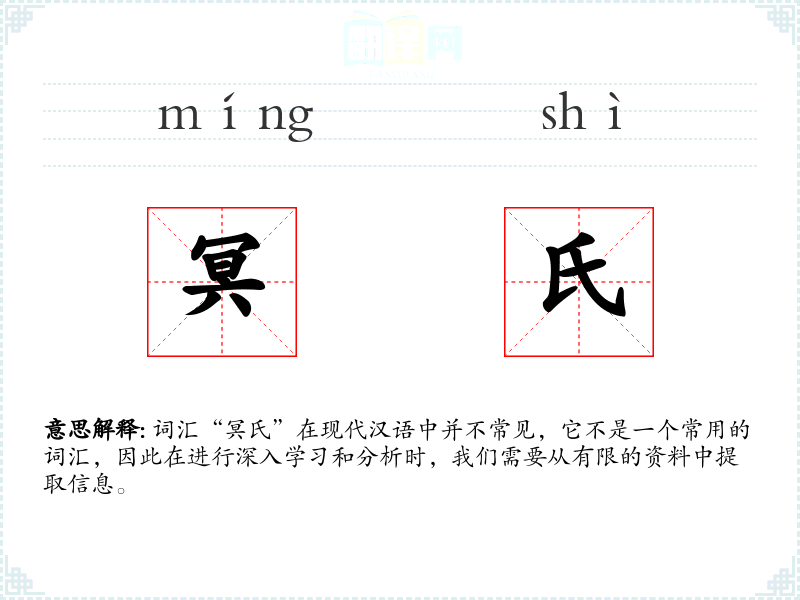 词汇“冥氏”在现代汉语中并不常见,它不是一个常用的词汇,因此在进行深入学*和分析时,我们需要从有限的资料中提取信息。