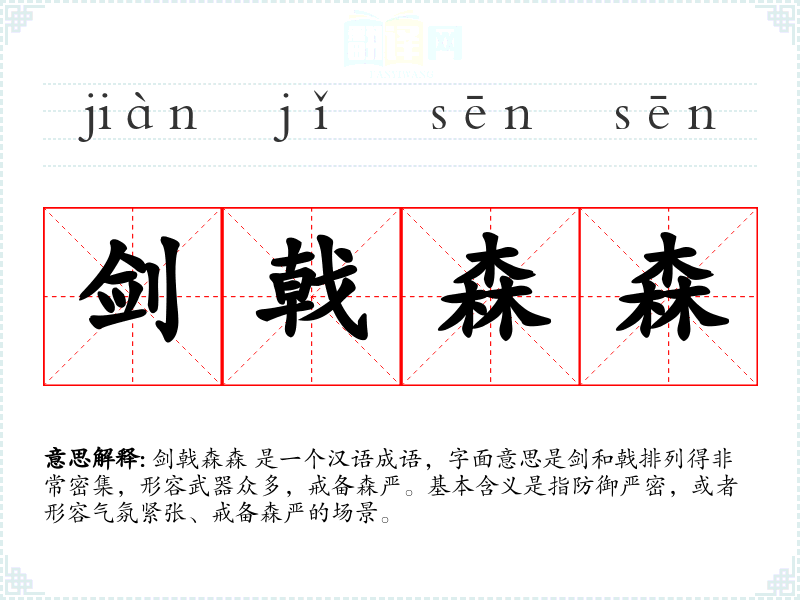 剑戟森森 是一个汉语成语,字面意思是剑和戟排列得非常密集,形容武器众多,戒备森严。基本含义是指防御严密,或者形容气氛紧张、戒备森严的场景。