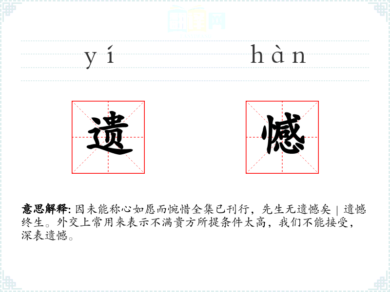 因未能称心如愿而惋惜全集已刊行,先生无遗憾矣|遗憾终生。外交上常用来表示不满贵方所提条件太高,我们不能接受,深表遗憾。