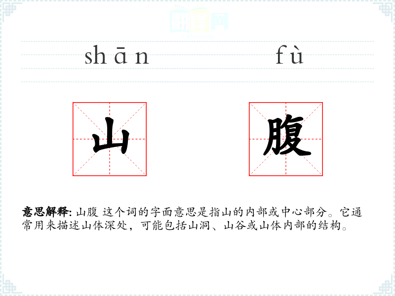 山腹 这个词的字面意思是指山的内部或中心部分。它通常用来描述山体深处,可能包括山洞、山谷或山体内部的结构。
