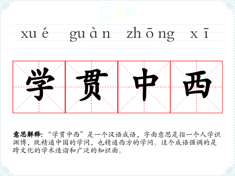 “学贯中西”是一个汉语成语,字面意思是指一个人学识渊博,既精通**的学问,也精通西方的学问。这个成语强调的是跨文化的学术造诣和广泛的知识面。