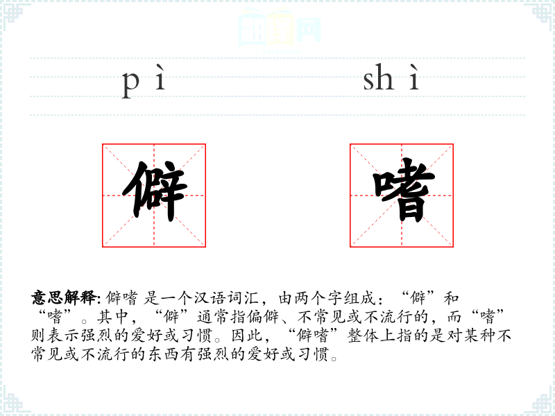 僻嗜 是一个汉语词汇,由两个字组成:“僻”和“嗜”。其中,“僻”通常指偏僻、不常见或不流行的,而“嗜”则表示强烈的爱好或惯。因此,“僻嗜”整体上指的是对某种不常见或不流行的东西有强烈的爱好或惯。