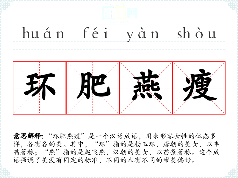 “环肥燕瘦”是一个汉语成语,用来形容女性的体态多样,各有各的美。其中,“环”指的是杨玉环,唐朝的美女,以丰满著称;“燕”指的是赵飞燕,汉朝的美女,以苗条著称。这个成语强调了美没有固定的标准,不同的人有不同的审美偏好。