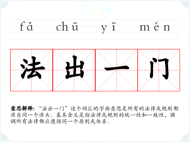 “法出一门”这个词汇的字面意思是所有的法律或规则都源自同一个源头。基本含义是指法律或规则的统一性和一致性,强调所有法律都应遵循同一个原则或体系。