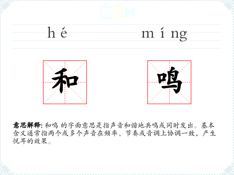 和鸣 的字面意思是指声音和谐地共鸣或同时发出。基本含义通常指两个或多个声音在频率、节奏或音调上协调一致,产生悦耳的效果。
