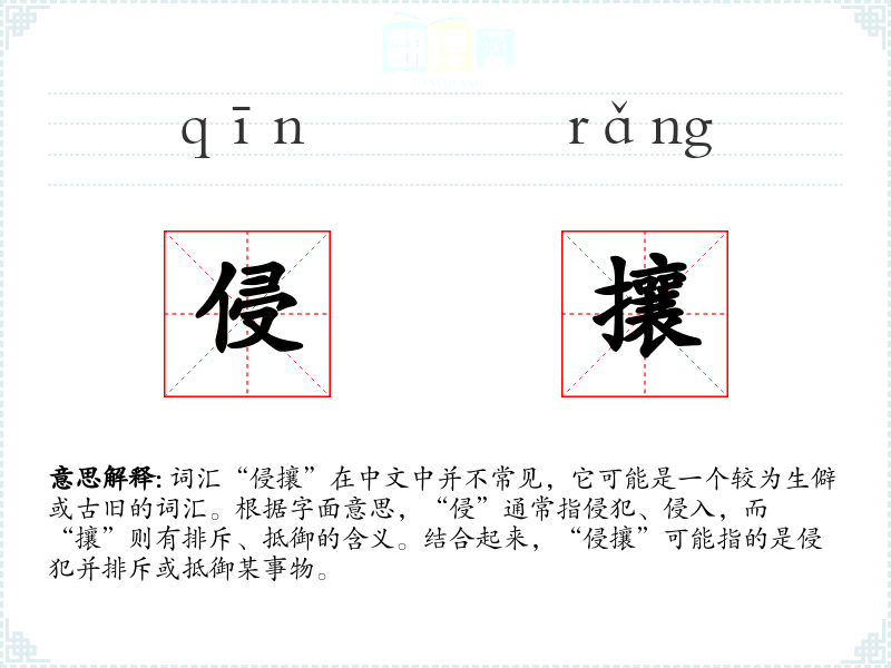 词汇“侵攘”在中文中并不常见,它可能是一个较为生僻或古旧的词汇。根据字面意思,“侵”通常指侵犯、侵入,而“攘”则有排斥、抵御的含义。结合起来,“侵攘”可能指的是侵犯并排斥或抵御某事物。