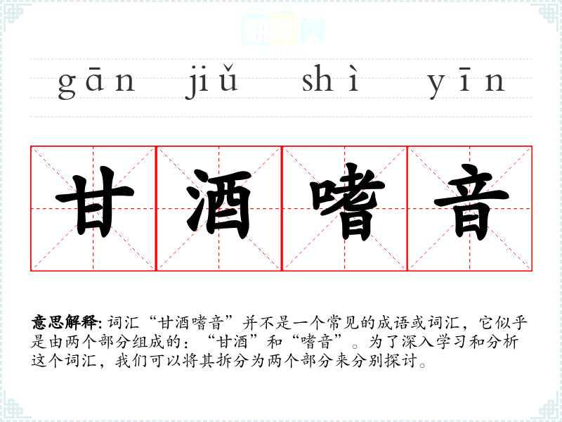 词汇“甘酒嗜音”并不是一个常见的成语或词汇,它似乎是由两个部分组成的:“甘酒”和“嗜音”。为了深入学习和分析这个词汇,我们可以将其拆分为两个部分来分别探讨。