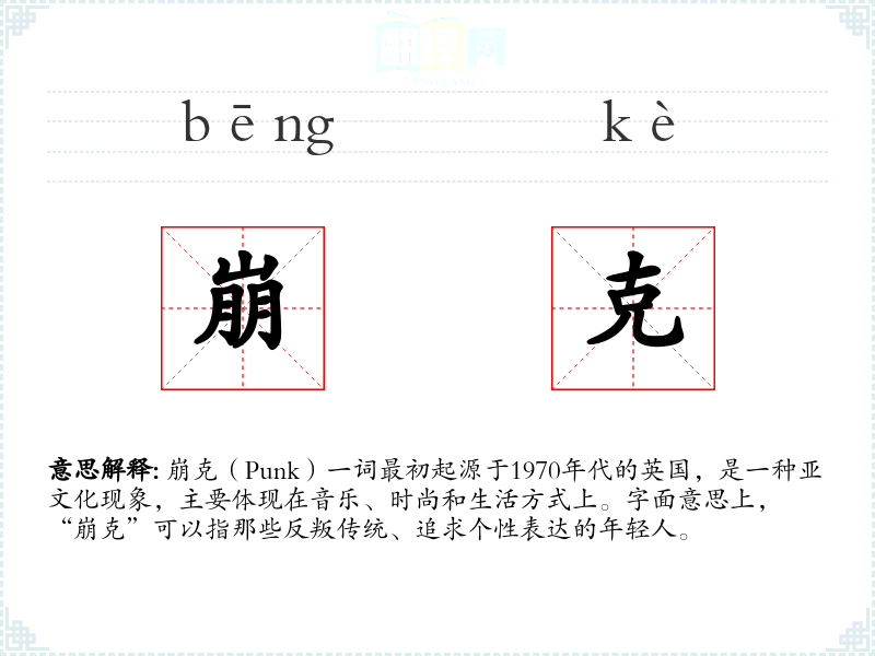 崩克(Punk)一词最初起源于1970年代的英国,是一种亚文化现象,主要体现在音乐、时尚和生活方式上。字面意思上,“崩克”可以指那些反叛传统、追求个性表达的年轻人。