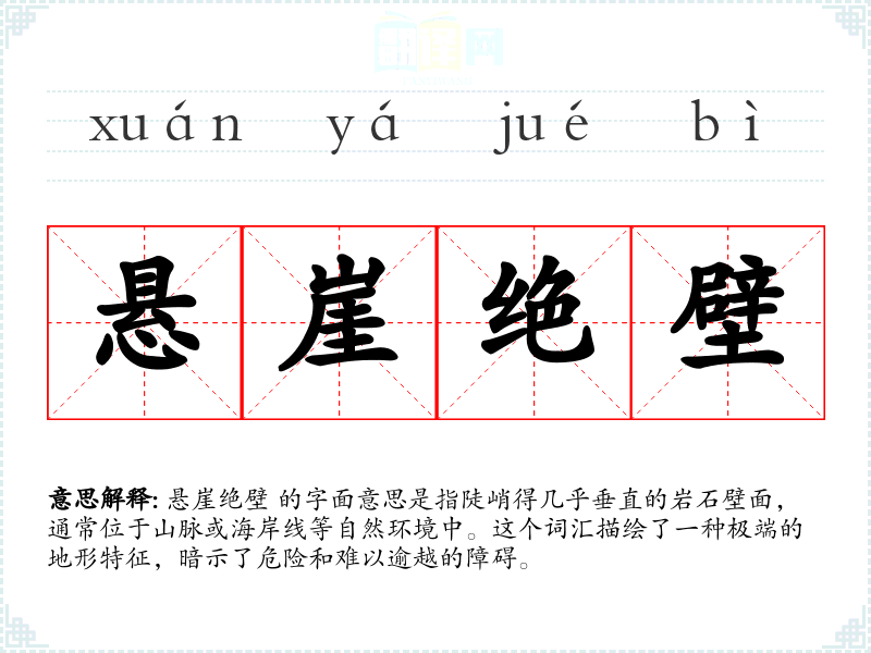悬崖绝壁 的字面意思是指陡峭得几乎垂直的岩石壁面,通常位于山脉或海岸线等自然环境中。这个词汇描绘了一种极端的地形特征,暗示了危险和难以逾越的障碍。