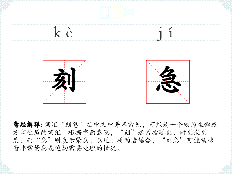 词汇“刻急”在中文中并不常见,可能是一个较为生僻或方言性质的词汇。根据字面意思,“刻”通常指雕刻、时刻或刻度,而“急”则表示紧急、急迫。将两者结合,“刻急”可能意味着非常紧急或迫切需要处理的情况。