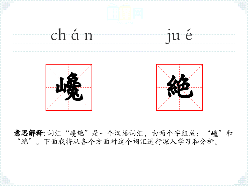 “巉”字古已有之,源自古代对山势险峻的描述。“绝”字则有超越、极限的含义。两个字组合在一起,形成了形容山势险峻到极点的词汇。
