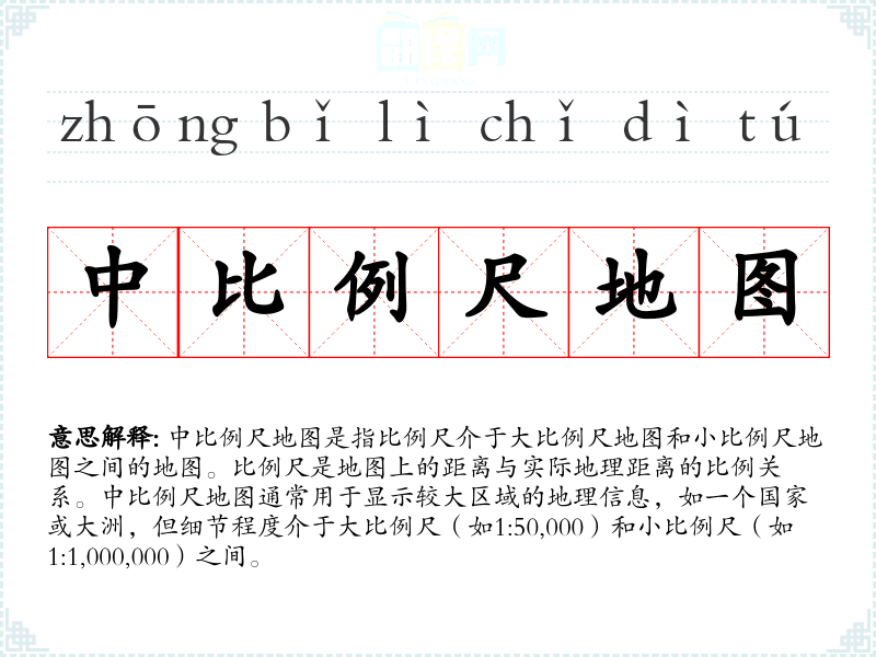 同义词:中等比例尺地图、中尺度地图 反义词:大比例尺地图、小比例尺地图