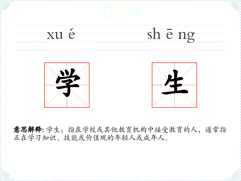 学生:指在学校或其他教育机构中接受教育的人,通常指正在学*知识、技能或价值观的年轻人或成年人。