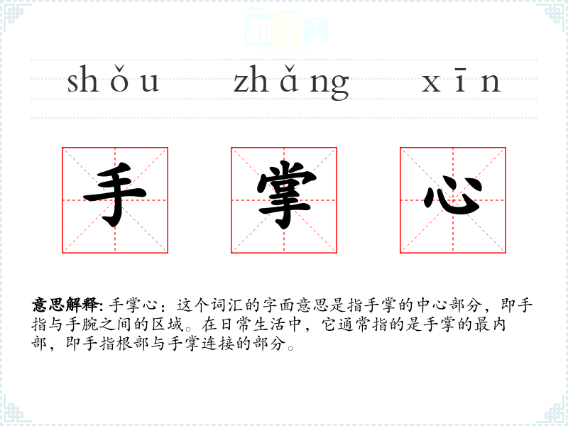 手掌心的词源较为直接,由“手掌”和“心”两个词组合而成,表示手掌的中心部分。在古代汉语中,手掌心可能没有特定的词汇,而是通过描述性的语言来表达。