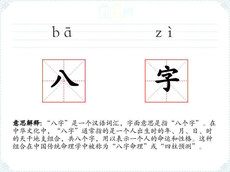 “八字”是一个汉语词汇,字面意思是指“八个字”。在中华文化中,“八字”通常指的是一个人出生时的年、月、日、时的天干地支组合,共八个字,用以表示一个人的命运和性格。这种组合在**传统命理学中被称为“八字命理”或“四柱预测”。