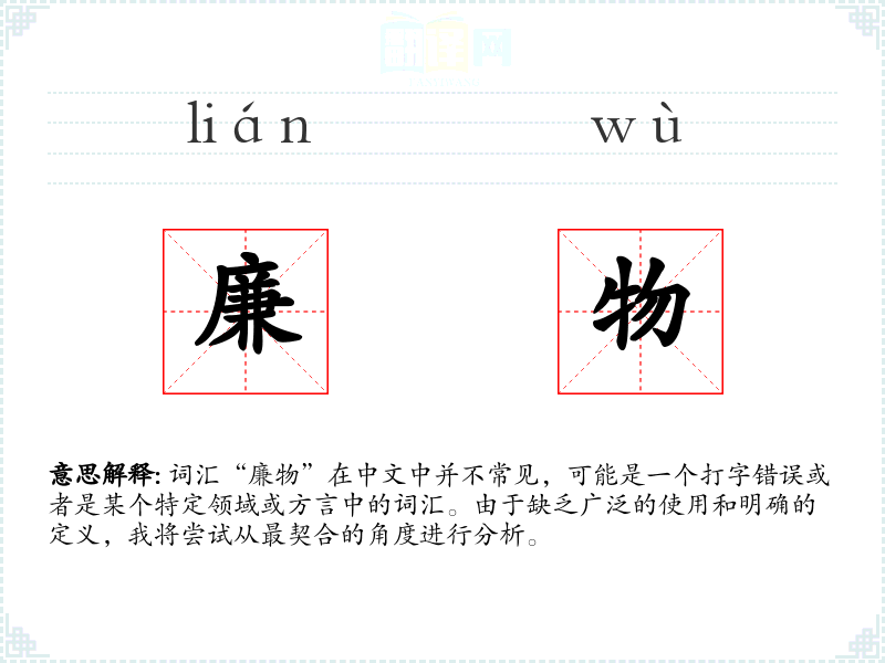 由于“廉物”不是一个标准的中文词汇,我们无法给出确切的字面意思和基本含义。如果将其拆分为“廉”和“物”,“廉”通常指价格低廉或廉洁,“物”指物品或事物。结合来看,“廉物”可能指的是价格低廉的物品,或者是与廉洁有关的物品。