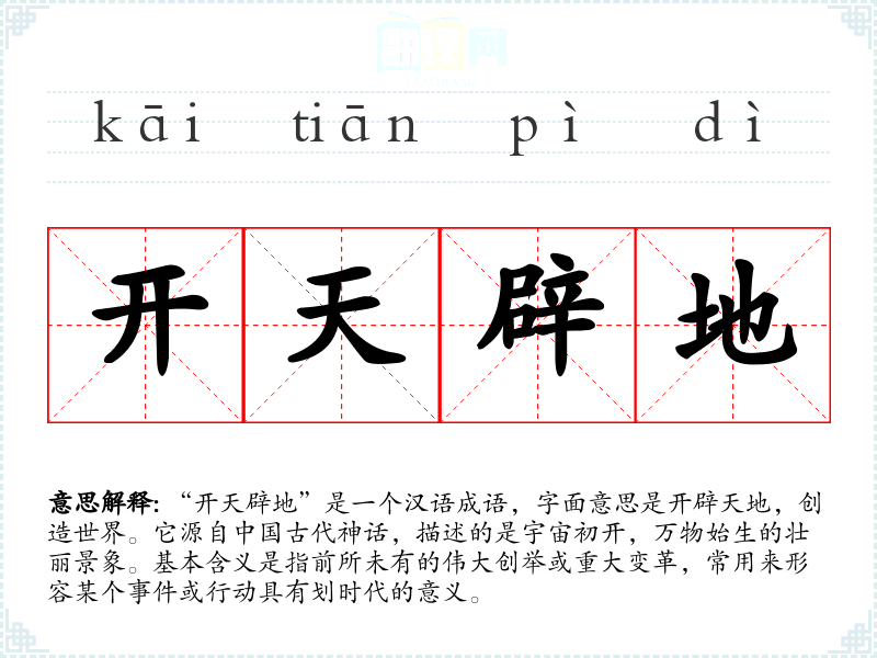 “开天辟地”源自古代神话《山海经》中的盘古开天辟地的故事。盘古是神话中的一位巨人,他用斧头劈开混沌,轻者上升为天,重者下沉为地,从而创造了世界。这个成语随着时间的推移,逐渐被用来形容任何具有划时代意义的伟大创举。