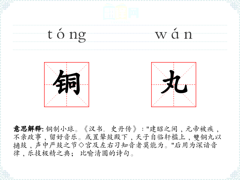 1.铜制小球。《汉书.史丹传》﹕"建昭之间﹐元帝被疾﹐不亲政事﹐留好音乐。或置鼙鼓殿下﹐天子自临轩槛上﹐雙铜丸以擿鼓﹐声中严鼓之节◇宫及左右习知音者莫能为。"后用为深谙音律﹐乐技极精之典; 比喻清圆的诗句。