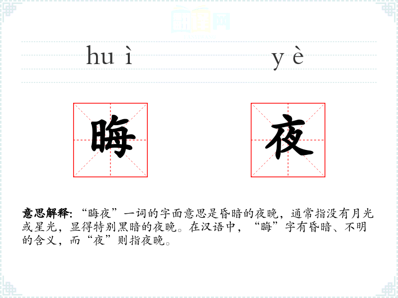 “晦夜”一词的字面意思是昏暗的夜晚,通常指没有月光或星光,显得特别黑暗的夜晚。在汉语中,“晦”字有昏暗、不明的含义,而“夜”则指夜晚。