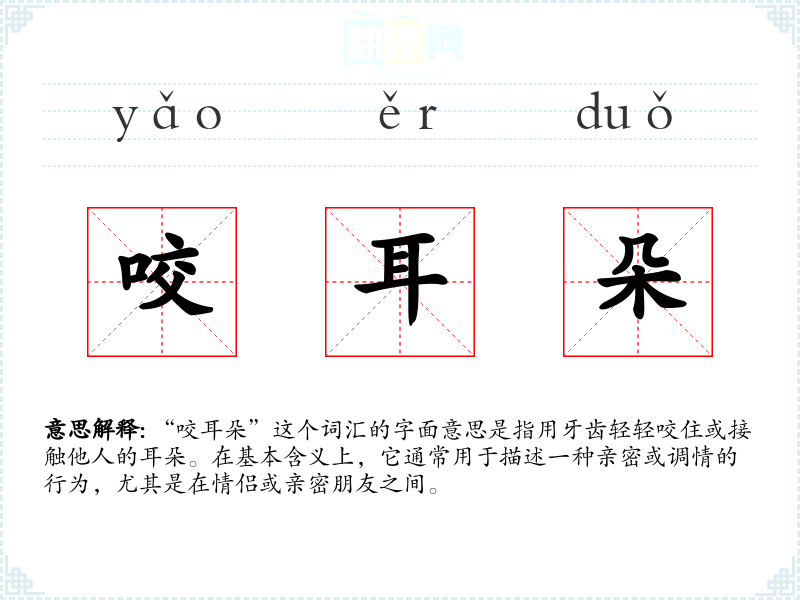 “咬耳朵”这个词汇的字面意思是指用牙齿轻轻咬住或接触他人的耳朵。在基本含义上,它通常用于描述一种亲密或调情的行为,尤其是在情侣或亲密朋友之间。