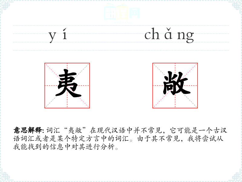 词汇“夷敞”在现代汉语中并不常见,它可能是一个古汉语词汇或者是某个特定方言中的词汇。由于其不常见,我将尝试从我能找到的信息中对其进行分析。