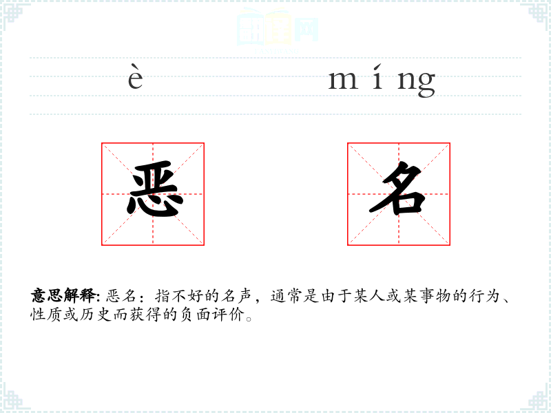 - 词源:恶名由“恶”和“名”两个字组成,“恶”表示不好、负面,“名”表示名声、声誉。