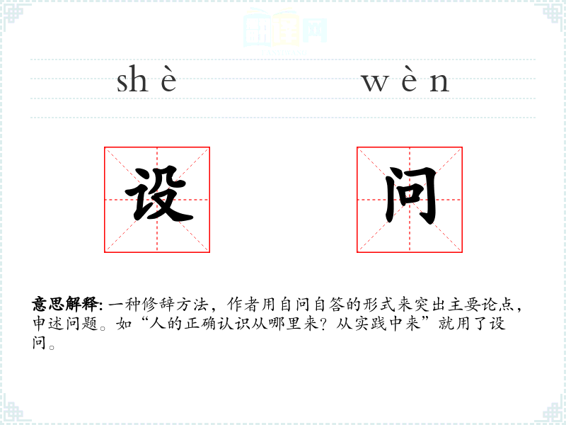 一种修辞方法,作者用自问自答的形式来突出主要论点,申述问题。如“人的正确认识从哪里来?从实践中来”就用了设问。