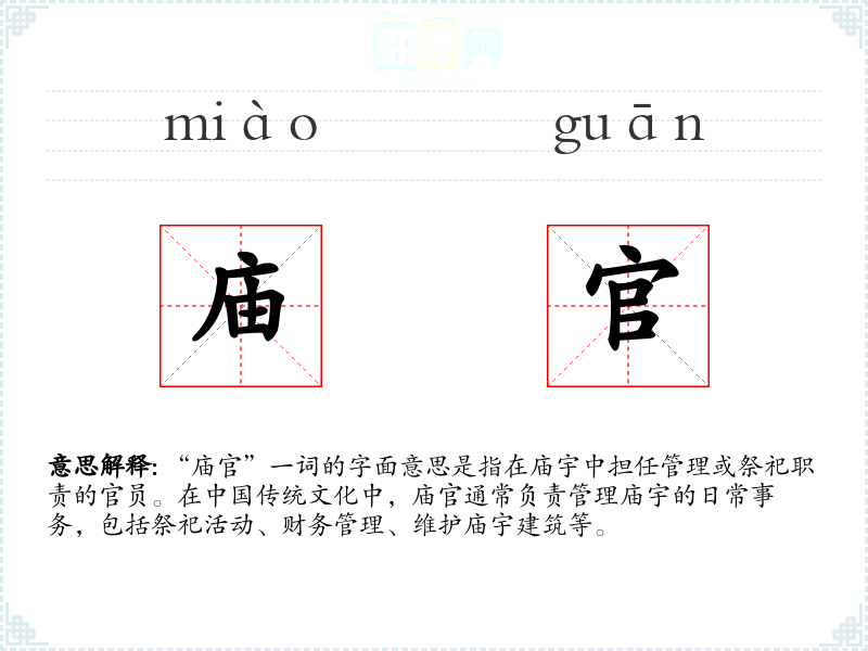“庙官”这个词可能让人联想到古代的庄严仪式和神秘的**氛围。它可能唤起对传统文化的尊重和对历史的敬畏感。