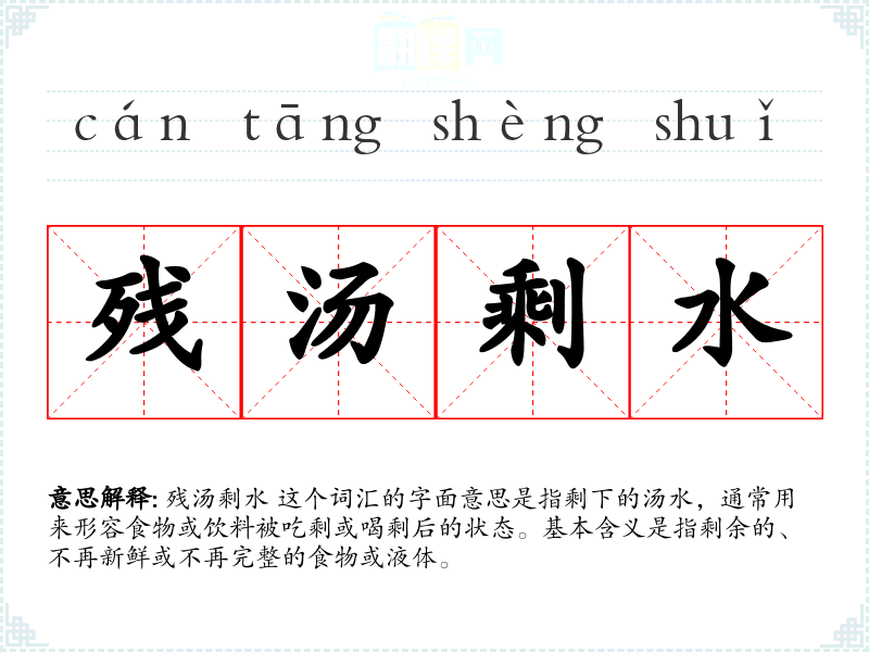 "残汤剩水"这个词汇的词源较为直接,由“残”和“剩”两个表示剩余的词素组成,加上“汤”和“水”这两个表示食物和液体的词素。在古代汉语中,类似的表达方式已经存在,随着时间的推移,这个词汇的使用逐渐固定下来。