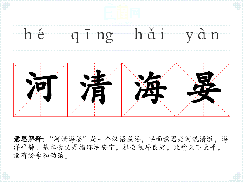 “河清海晏”是一个汉语成语,字面意思是河流清澈,海洋平静。基本含义是指环境安宁,社会秩序良好,比喻天下太平,没有纷争和动荡。