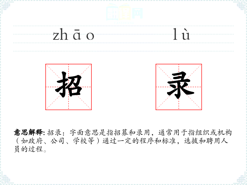 招录:字面意思是指招募和录用,通常用于指组织或机构(如政府、公司、学校等)通过一定的程序和标准,选拔和聘用人员的过程。