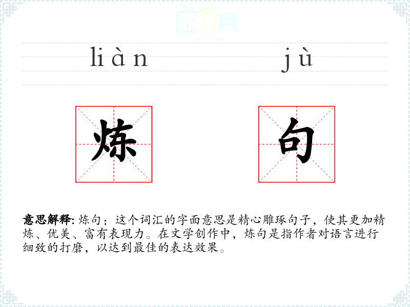 炼句:这个词汇的字面意思是精心雕琢句子,使其更加精炼、优美、富有表现力。在文学创作中,炼句是指作者对语言进行细致的打磨,以达到最佳的表达效果。