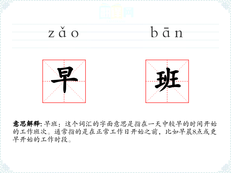 早班:这个词汇的字面意思是指在一天中较早的时间开始的工作班次。通常指的是在正常工作日开始之前,比如早晨8点或更早开始的工作时段。
