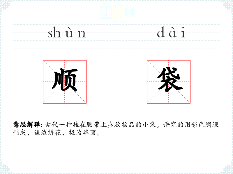 古代一种挂在腰带上盛放物品的小袋。讲究的用彩色绸缎制成,镶边绣花,极为华丽。