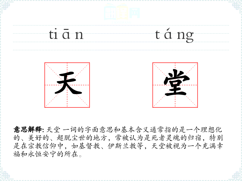 “天堂”一词源自古代汉语,最初指的是天空或高处,后来在影响下逐渐演变为指代一个超自然的、理想的居住地。在不同的文化和中,天堂的概念和描述有所不同,但其核心意义——一个完美的、幸福的所在——是共通的。
