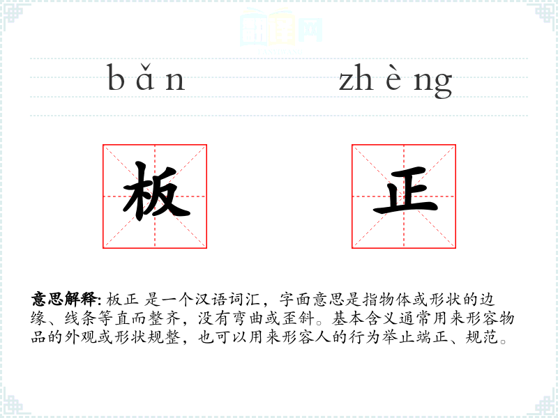 板正 是一个汉语词汇,字面意思是指物体或形状的边缘、线条等直而整齐,没有弯曲或歪斜。基本含义通常用来形容物品的外观或形状规整,也可以用来形容人的行为举止端正、规范。