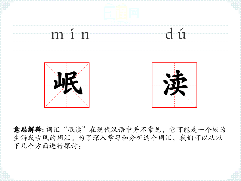 词汇“岷渎”在现代汉语中并不常见,它可能是一个较为生僻或古风的词汇。为了深入学*和分析这个词汇,我们可以从以下几个方面进行探讨: