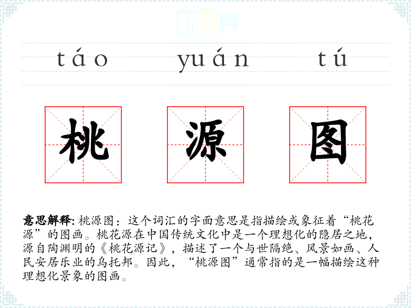 在文学中,“桃源图”常被用来象征理想的生活环境或逃避现实的精神寄托。在口语中,它可能被用来形容一个宁静、美丽的地方。在专业领域,如艺术史或文学研究中,它可能特指具体的艺术作品或文学作品中的描绘。