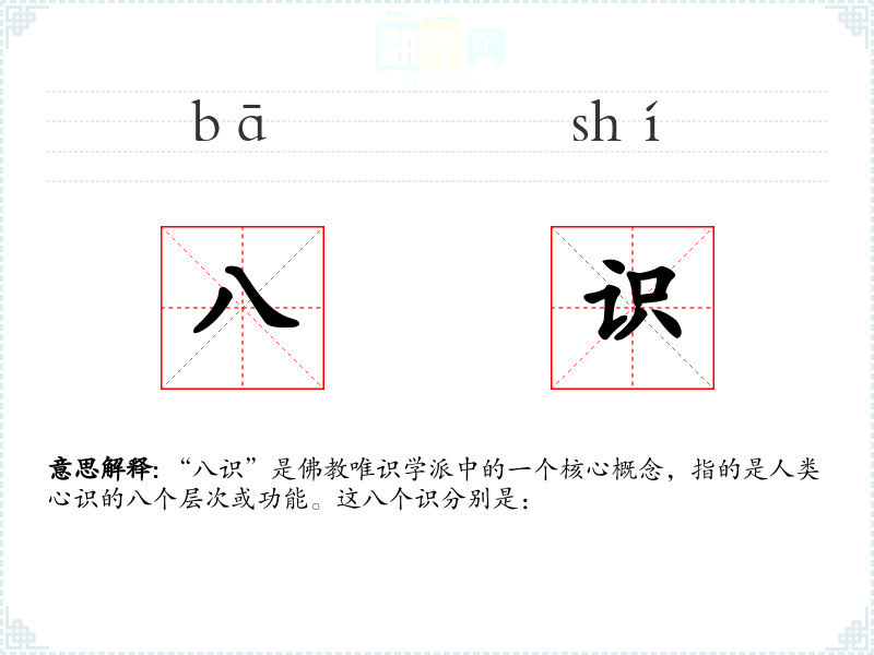 “八识”是**唯识学派中的一个核心概念,指的是人类心识的八个层次或功能。这八个识分别是: