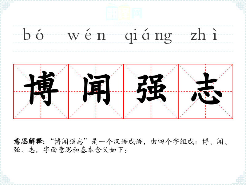 “博闻强志”是一个汉语成语,由四个字组成:博、闻、强、志。字面意思和基本含义如下: