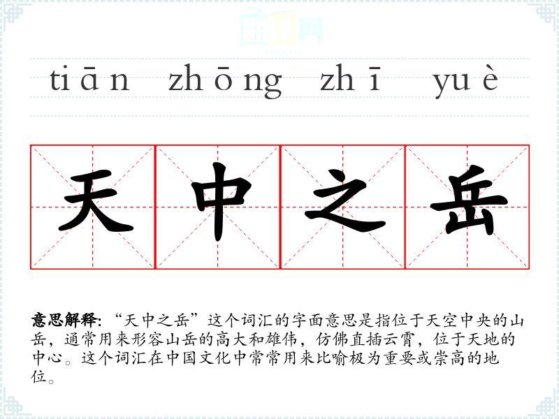 “天中之岳”这个词汇的字面意思是指位于天空中央的山岳,通常用来形容山岳的高大和雄伟,仿佛直插云霄,位于天地的中心。这个词汇在**文化中常常用来比喻极为重要或崇高的地位。