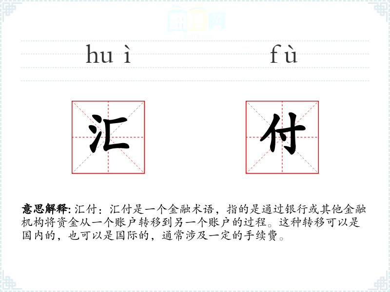 汇付:汇付是一个金融术语,指的是通过银行或其他金融机构将资金从一个账户转移到另一个账户的过程。这种转移可以是国内的,也可以是国际的,通常涉及一定的手续费。