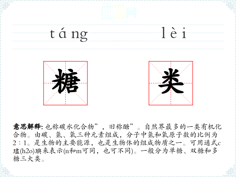 1.也称碳水化合物”,旧称醣”。自然界最多的一类有机化合物。由碳、氢、氧三种元素组成,分子中氢和氧原子数的比例为2∶1。是生物的主要能源,也是生物体的组成物质之一。可用通式c璶(h2o)璵来表示(n和m可同,也可不同)。一般分为单糖、双糖和多糖三大类。