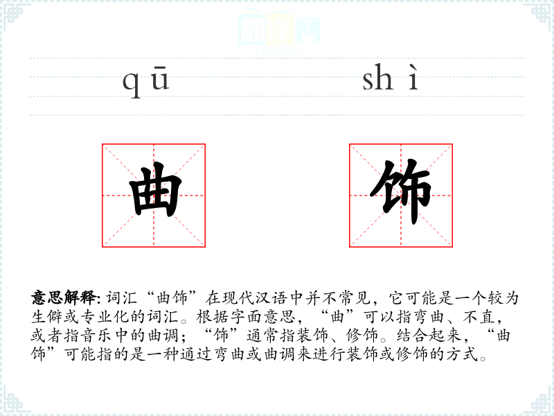 词汇“曲饰”在现代汉语中并不常见,它可能是一个较为生僻或专业化的词汇。根据字面意思,“曲”可以指弯曲、不直,或者指音乐中的曲调;“饰”通常指装饰、修饰。结合起来,“曲饰”可能指的是一种通过弯曲或曲调来进行装饰或修饰的方式。